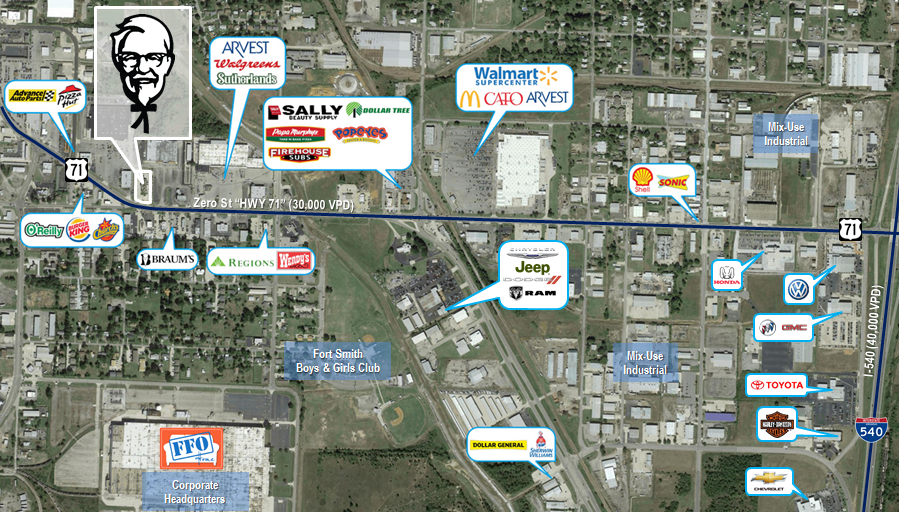 - Located along Hwy 71 (39K VPD), just W of I-540 (40K VDP)